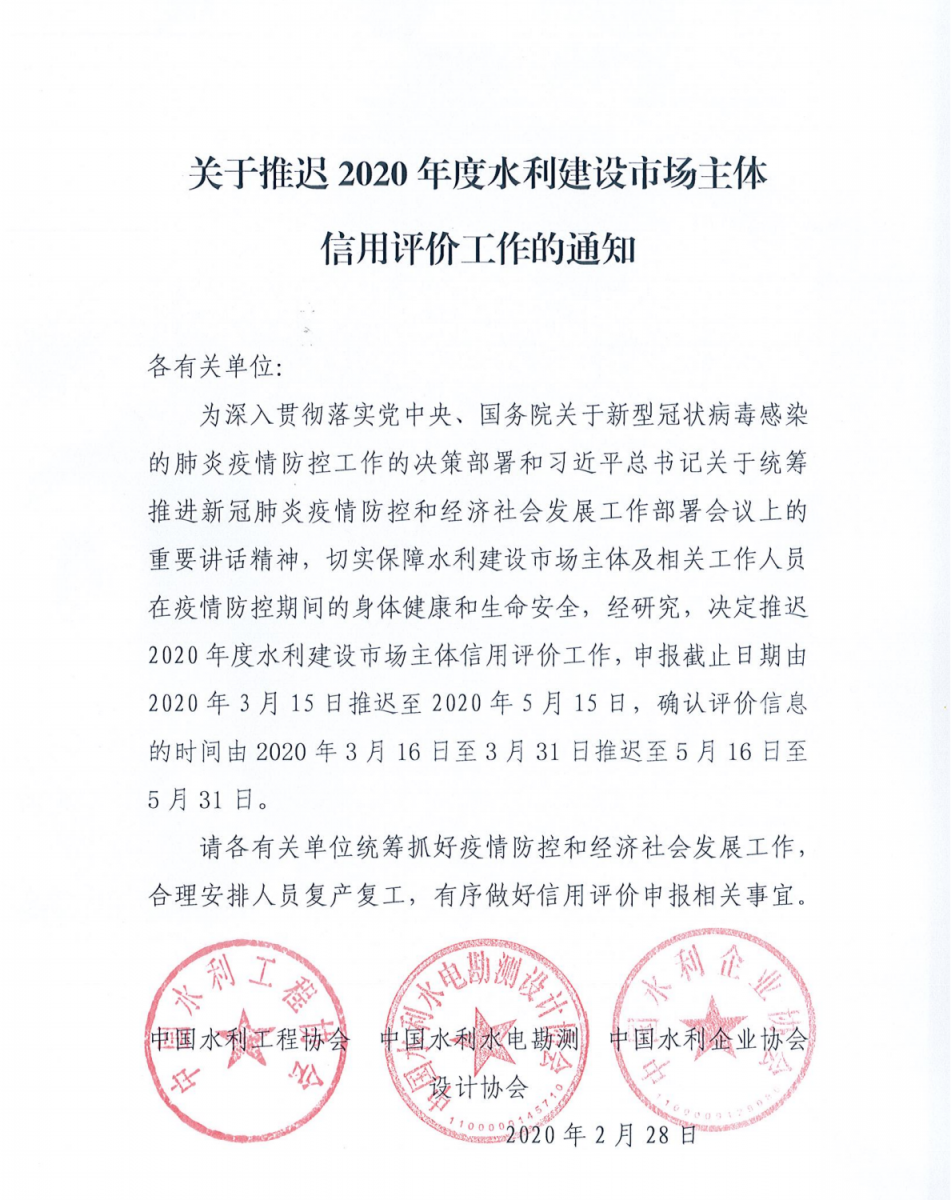 關(guān)于推遲2020年度水利建設(shè)市場(chǎng)主體信用評(píng)價(jià)工作的通知