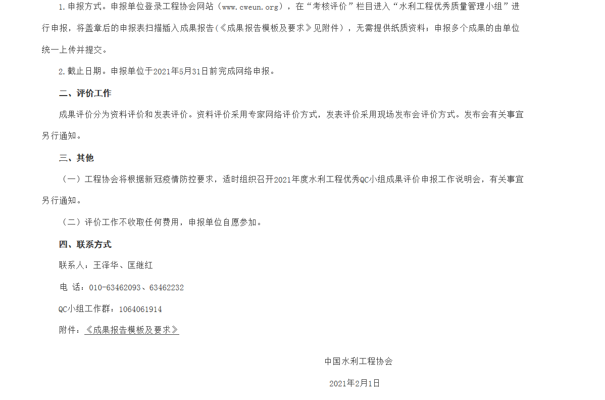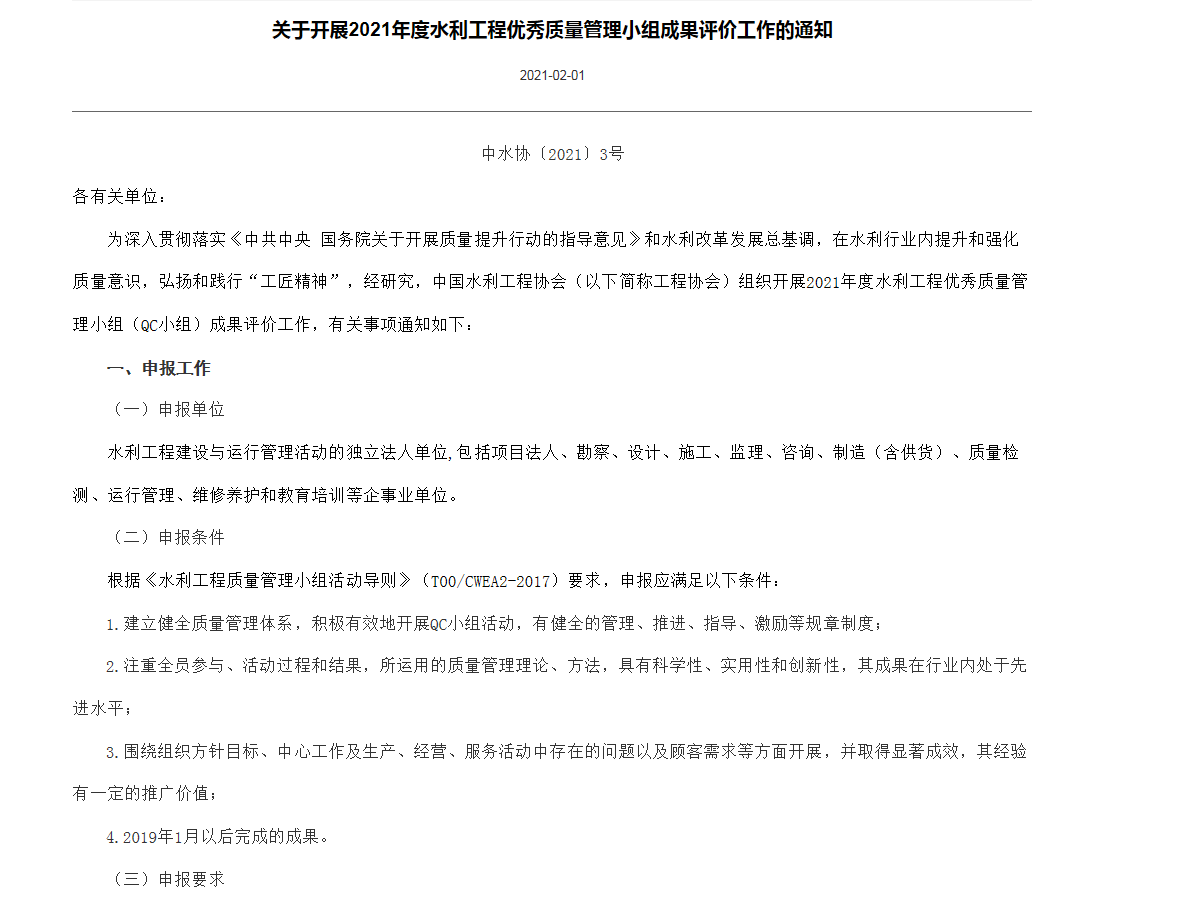 關(guān)于開展2021年度水利工程優(yōu)秀質(zhì)量管理小組成果評價(jià)工作的通知